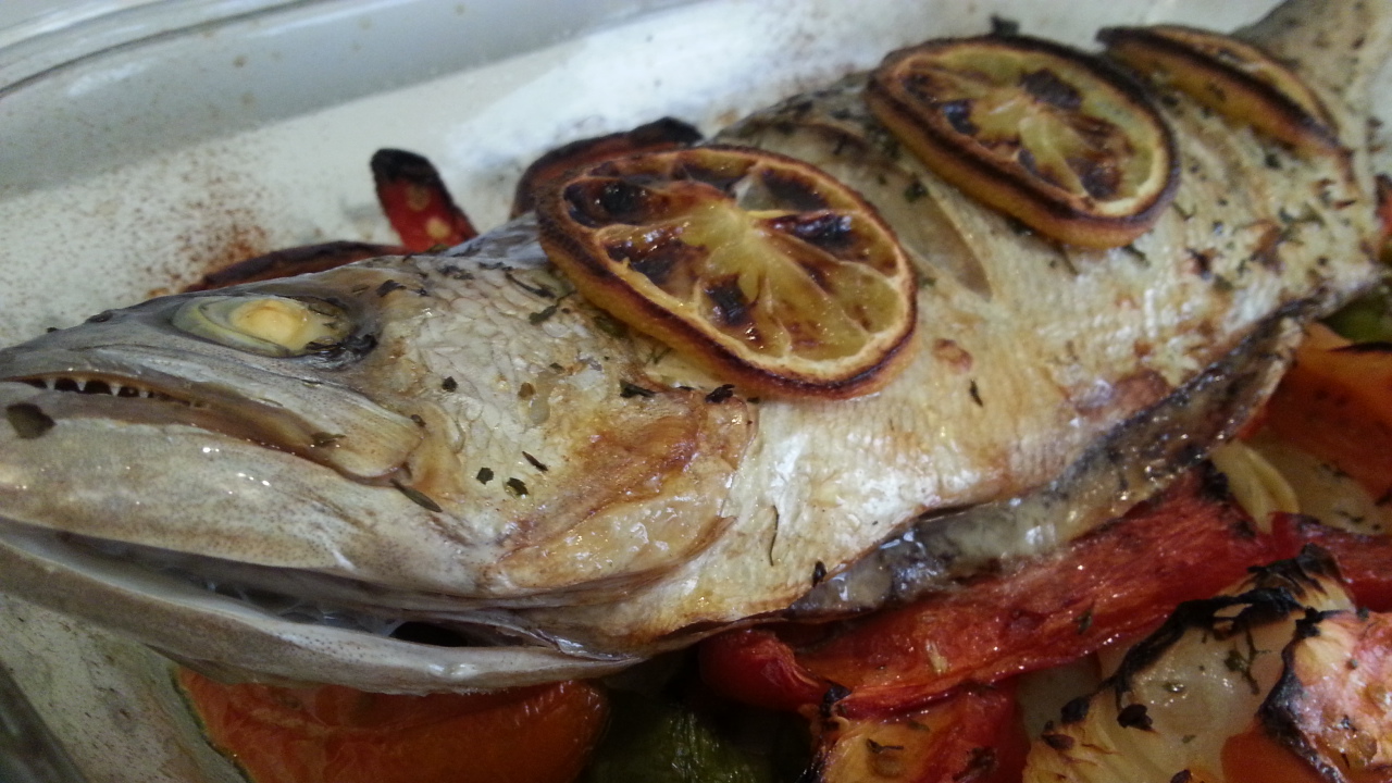 Una vez que ya le hemos dado el primer calentón a las verduras, las sacamos y ponemos sobre ellos la chova, a la que echamos sal y aceite y espolvoreamos con cilantro por encima. También le echamos un toque de vino blanco (nosotros le hemos echado tan sólo un chorreón) y volvemos a meter en el horno a la misma temperatura durante 25 – 30 minutos (Os recomiendo que en la parte final vigiléis el pescado). Nosotros le hemos puesto unas rodajillas de limón encima.