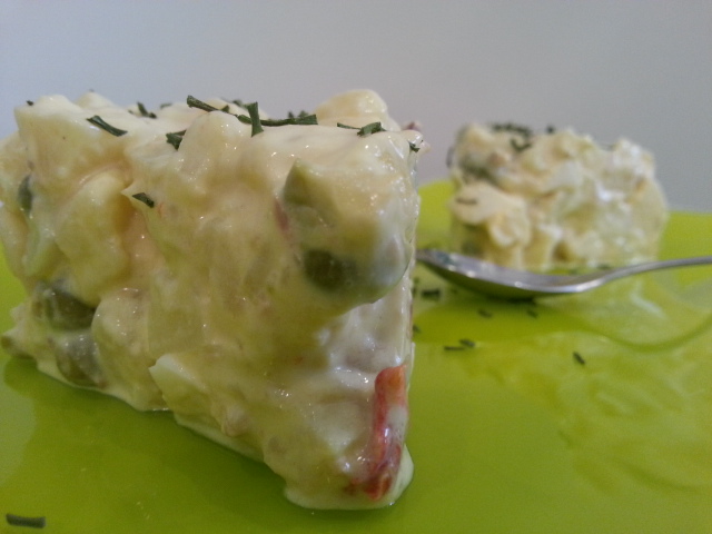 Nosotros hemos optado por presentarla ayudándonos de un molde y dándole una forma triángular sobre un plato verde, para resaltar las tonalidades blancas de la mahonesa. Es muy fácil de hacer y muy rica de comer, os la recomiendo…….porque para la ensaladilla, aún siendo un plato frío no hay época del año.