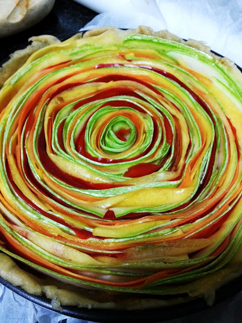 Cortamos todas las verduras de manera alargada con un pela patatas, una vez la tenemos todas, ponemos en un molde la masa quebrada y vamos poniendo las diferentes verduras enrrolladas de manera intercalada para ir jugando con los colores, una vez tengamos toda la espiral terminada,mejor comenzar desde el centro hacía fuera.