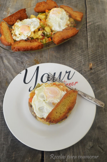 Ponemos las verduras con las patatas en una bandeja, alrededor el pan frito y encima un huevo frito por persona.