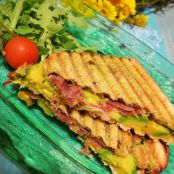 Sándwich caliente de pesto, jamón ibérico y aguacate