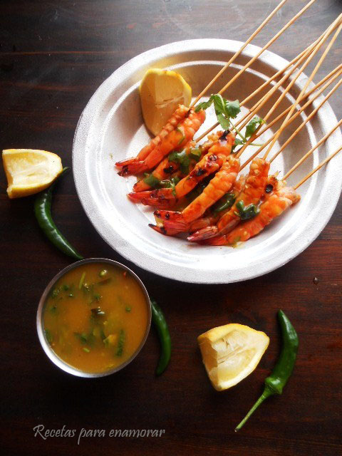 Retire del refrigerador los langostinos y poner a la plancha o barbacoa hasta que estén doraditos.