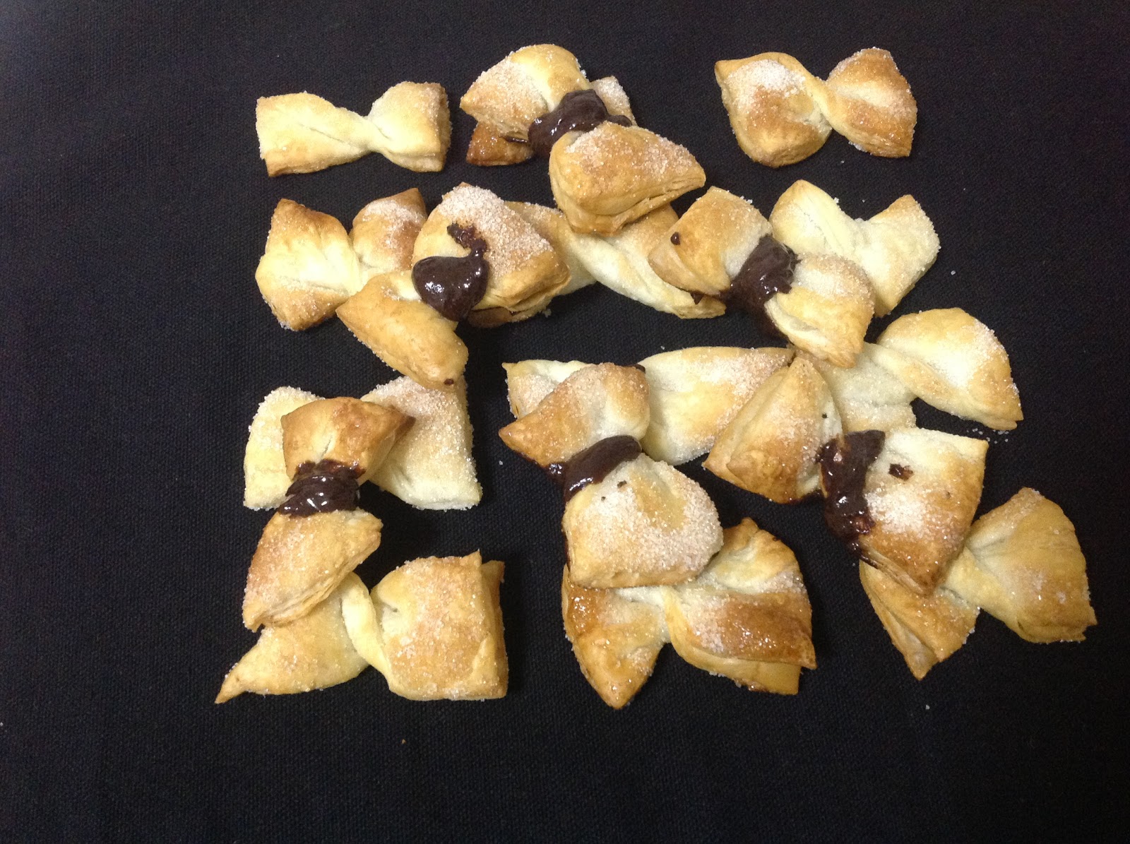 - Cogemos los lazos, ya frios, por la parte central y mojamos en el chocolate cada una de las dos puntas. Los dejamos que seque la cobertura….y a disfrutar!!