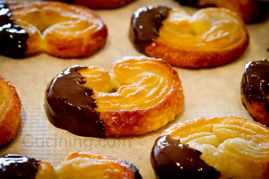 spolvoreamos algo de harina en la encimera para manejar la masa mejor. Extendemos la masa de hojaldre y espolvoreamos generosamente con azúcar por toda la superficie. Le pasamos el rodillo para que se adhiera el azúcar. Le damos la vuelta a la plancha y repetimos la operación, le echamos el azucar y pasamos el rodillo. Aprovechamos para que la masa nos quede lo mas rectangular posible.