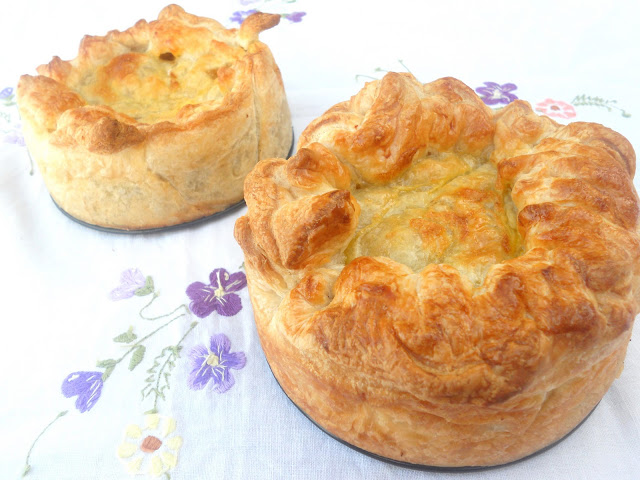 Las masas para el pie puede ser de varios tipos, encontramos la pasta quebrada, el hojaldre, galletas, una masa hecha con patatas e incluso con migas de pan. Nosotros nos centraremos en prepararla con hojaldre o pasta quebrada. Se puede rellenar también de pescado o tan solo de verduras y las maneras de presentación hay muy diversas se pueden hacer individuales como las que yo hice o en una fuente más grande,se suele acompañar,de patatas,arroz o algo más ligero como alguna verdura tipo brocoli o guisantes que es lo que yo elegí.