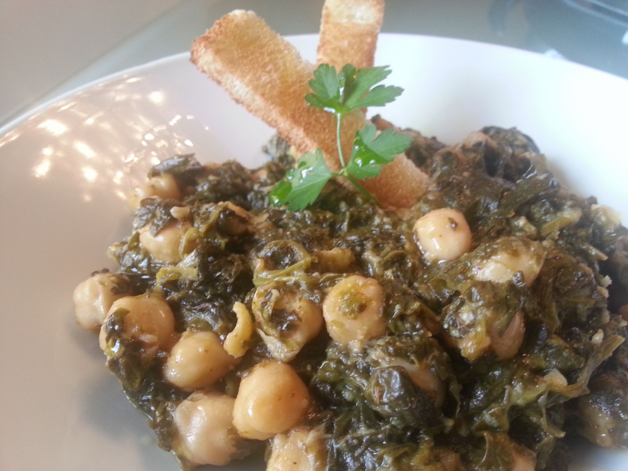 Una vez que ya tenemos todas las partes sólo consiste en unirlas. En una sartén amplia, echamos las espinacas y los garbanzos y calentamos. Retiramos del fuego y echamos el pimentón, para que no se nos queme. Y seguidamente añadimos el “majao” que hemos formado en el mortero.