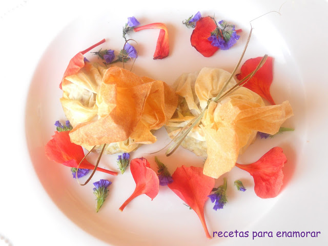 Cogemos una lamina de la masa brick la cortamos en dos ponemos un poco de la mezcla del pollo y lo cerramos en forma de saquito con un poco de hilo para cocinar.