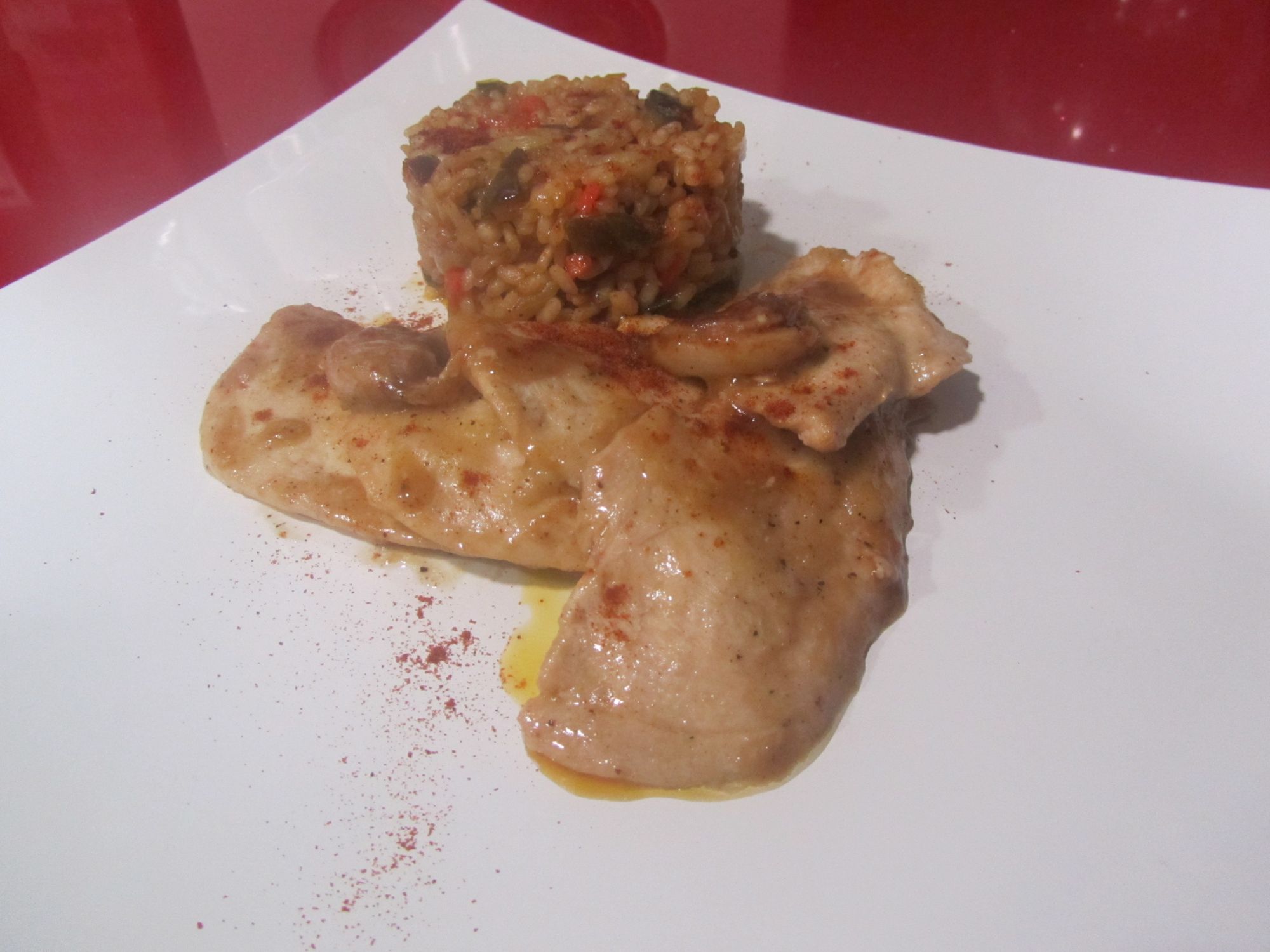 En un molde circular ponemos el arroz para retirarlo posteriormente y a su lado, servimos el pollo acompañado de su salsa. Espolvoreamos con pimentón y ya tenemos el plato terminado.
