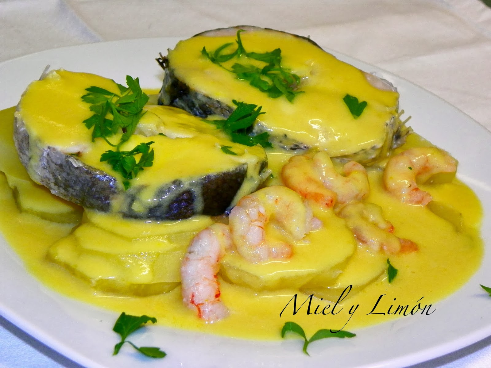 Cuando se ha salteado bien la patata y la cebolla, se añaden los lomos de merluza, previamente descongelados salpimentados, se cubre con el cava y se deja hacer a fuego medio