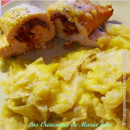 En una tabla se pone la pechuga estirada, le damos unos golpecitos para que se aplaste un poco. Vamos colocando los ingredientes por este orden; queso rallado encima el jamón serrano en trozos y encima los pimientos de piquillo enteros, se enrolla la pechuga, si hace falta la engancháis con unos palillos. Así se hacen las dos pechugas, se ponen en una fuente apta para horno se unta con el aceite de oliva, se rocía un poco con pino blanco y se espolvorea perejil por encima. Yo la acompañe con repollo cocido y salteado en la sartén con un poco de aceite y salsa de curry http://mariajoseysuscreaciones.blogspot.com.es/2012/11/salsa-de-curry.html