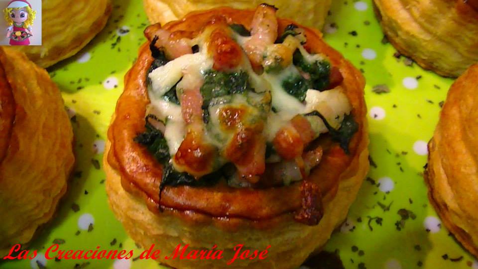 Se cuecen las espinacas, se escurren y se echan en una sartén con el bacón. Se rehoga todo bien con un poquito de sal y aceite de oliva. Se rellenan los volavanes, se espolvorea queso rallado. Se mete al horno a 200º hasta que el queso se derrita y listo para comer.
