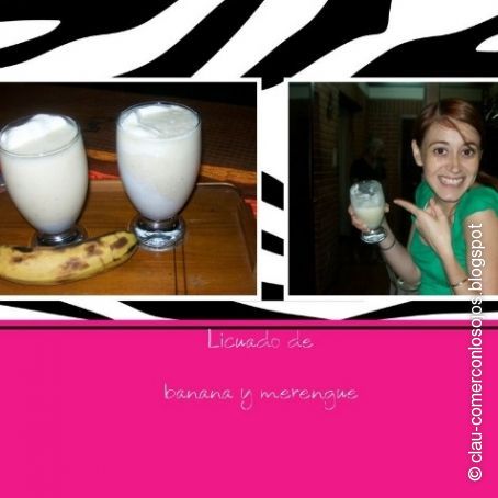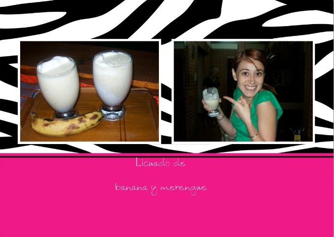 Licuamos las bananas con la leche, el azúcar y la crema y ponemos sobre el merengue. Dejen reposar unos minutos y van a ver como automáticamente el merengue sube solo arriba.