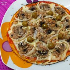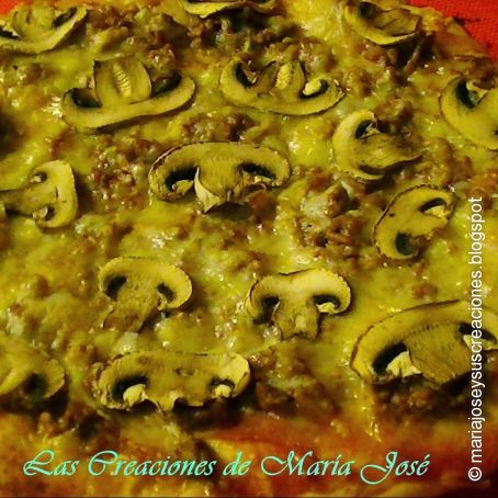 Yo pongo todos los ingredientes de la masa en la panificadora en el programa 9 que tarda 1,30. Cuando termina lo amaso un poco le doy la forma que quiero y dejo reposar la masa 20 minutos. Después de ese tiempo unto la masa de tomate, le echo encima queso rallado, coloco las tiras del becon, la carne picada ya rehogada. Echo encima otra vez queso rallado y encima coloco los champiñones laminados. Meto la pizza al horno a 200º has ver que esta echa unos 25 minutos.