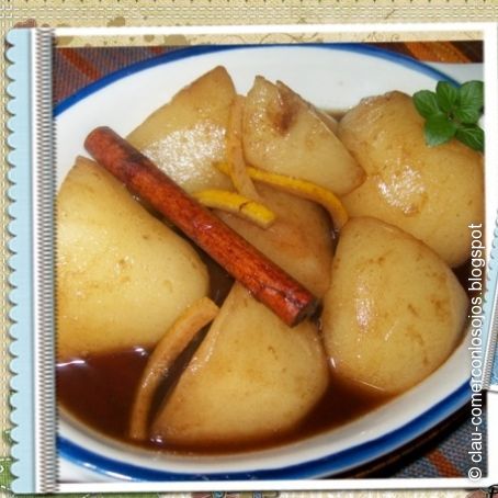 Colocar las peras con jugo, agua, la cáscara en juliana, azúcar y miel a hervir. Añadir la canela en rama.