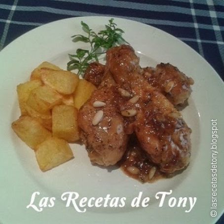 A continuación echamos los piñones y sazonamos a nuestro gusto con el tomillo, el orégano y el romero a continuación ponemos las 2 cucharadas de miel rehogar un poco con cuidado que no se rompas los muslos de pollo y dejar cocinar un par de minutos más para que vaya ligando y reduzca la salsa.