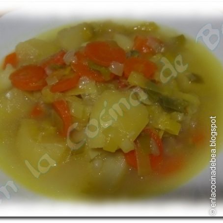 En la olla rápida, ponemos un poquito de aceite y sofreimos la cebolla, a fuego medio, unos 5 minutos, hasta que se quede transparente. Añadimos el puerro y rehogamos otros 5 minutos, más o menos, agregamos las zanahorias y las patatas, mezclamos todo bien y rehogamos otros 2 o 3 minutos.