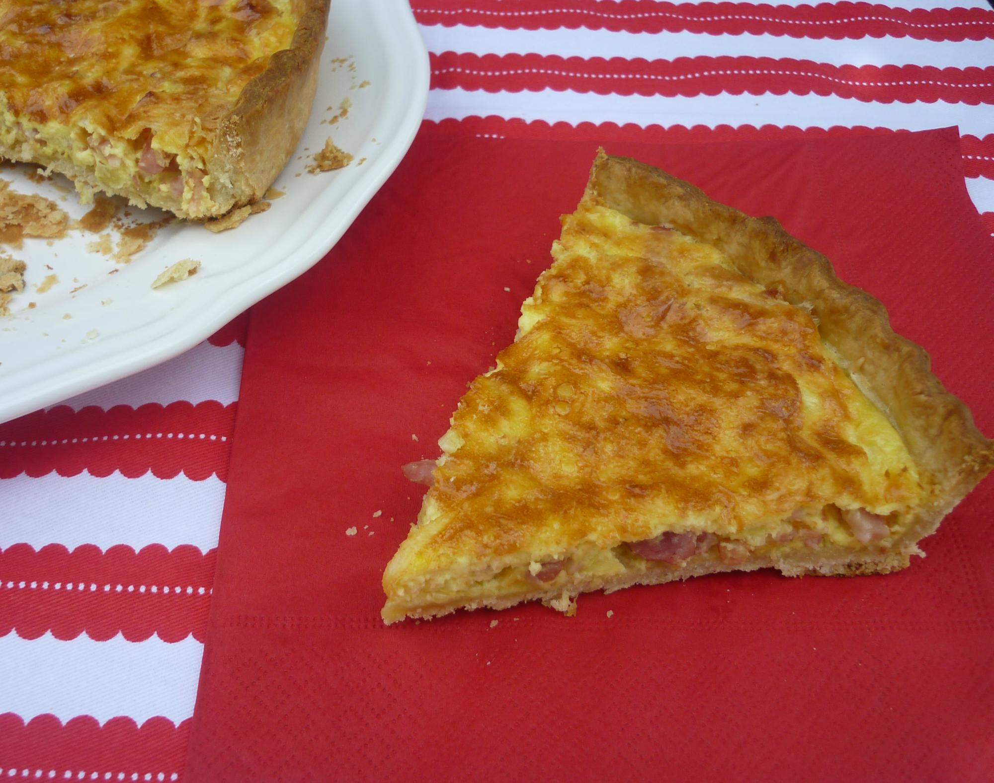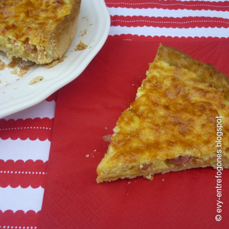 Cubrimos la masa con el bacon, el puerro y la mezcla de huevos y creme fraiche. Bajamos el horno a 160º y horneamos una media hora, hasta que esté cuajada y doradita.