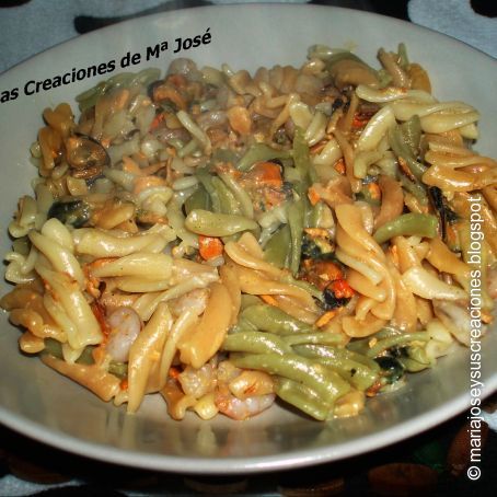 Se cuece la pasta y se escurre. Se echa en una sartén las gambas y los mejillones cortados por la mitad. Cuando veamos que están hechas las gambas echamos la pasta y la leche, removemos todo muy bien y vamos dando vueltas despacio hasta que se disuelva la leche.