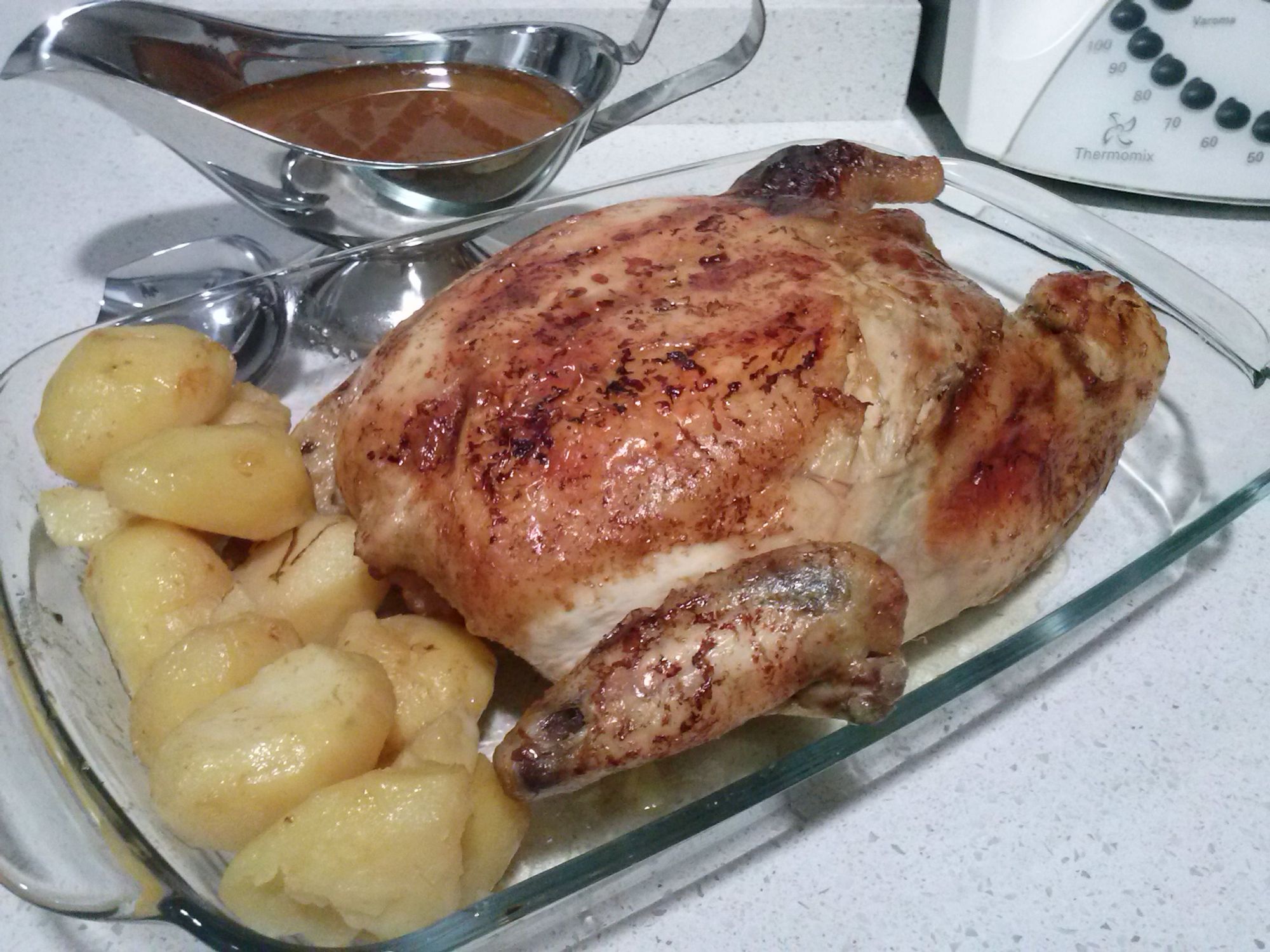 Le damos la vuelta a mitad de cocción, añadimos las patatas ya cocidas y los últimos 10 minutos le volvemos a dar la vuelta dejándolo con la postura inicial.