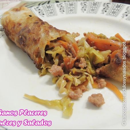 Cogemos la punta más cercana al pecho, la ponemos encima del relleno y damos una vuelta al rollito. Ahora, colocamos los dos lados del rollito doblados hacia el centro y seguimos dando vueltas hasta que nuestro rollito se cierre (si no se pega por sí silo, podemos pintar las puntas con huevo batido ya que éste nos hará de cola).