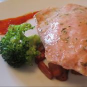 Para la presentación hemos optado por un plato blanco liso, de forma circular. Hemos colocado en la base el salteado de verduras y sobre él, la rodaja de salmón (nosotros hemos colocado una algo más grande pero la cantidad es mejor verlo según el apetito y tamaño de salmón).