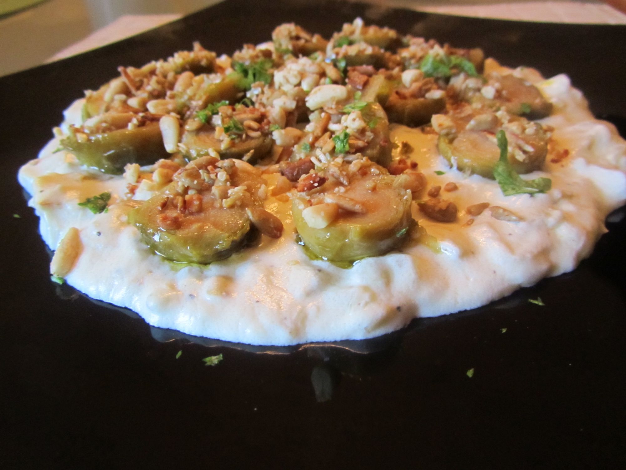 Disponemos la “bechamel” en la base del plato, después alineamos las coles (o ponemos de la forma que mejor creamos) y por último echamos las pipas y los piñones sobre estas.
