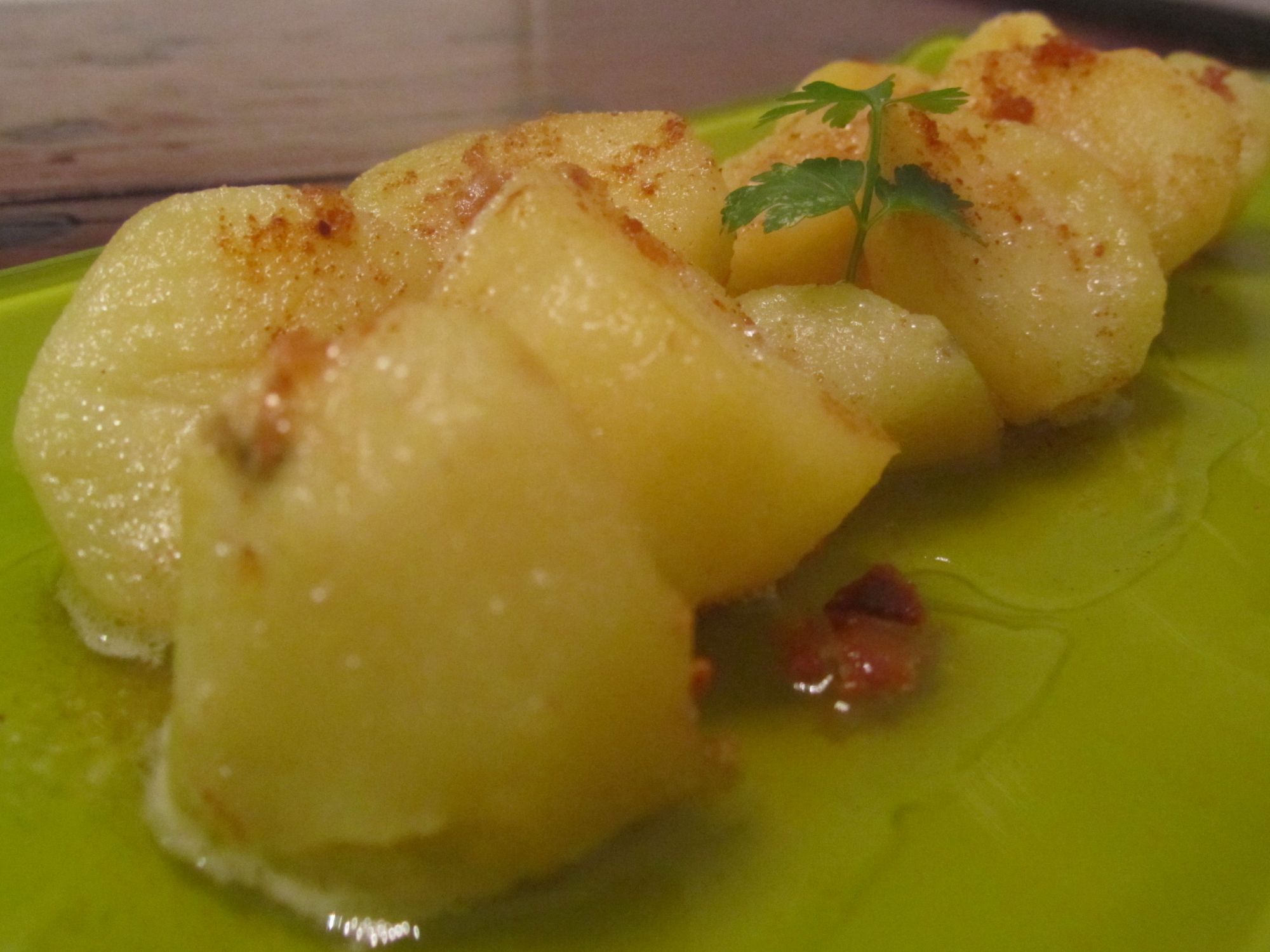 Echamos en una sartén una buena cantidad de mantequilla (unas dos cucharadas soperas en una sartén pequeña) para que la patata se fría/cueza en ella. Dejamos un tiempo considerable (unos 10 minutos) hasta que la patata vaya absorviendo mantequilla y se vaya aromatizando.