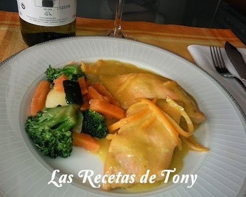 Emplatamos el salmón, y cubrimos con la salsa por lo alto, acompañado de la guarnición que nos guste, verduras, arroz pilaf o patas cocidas.