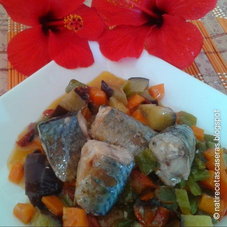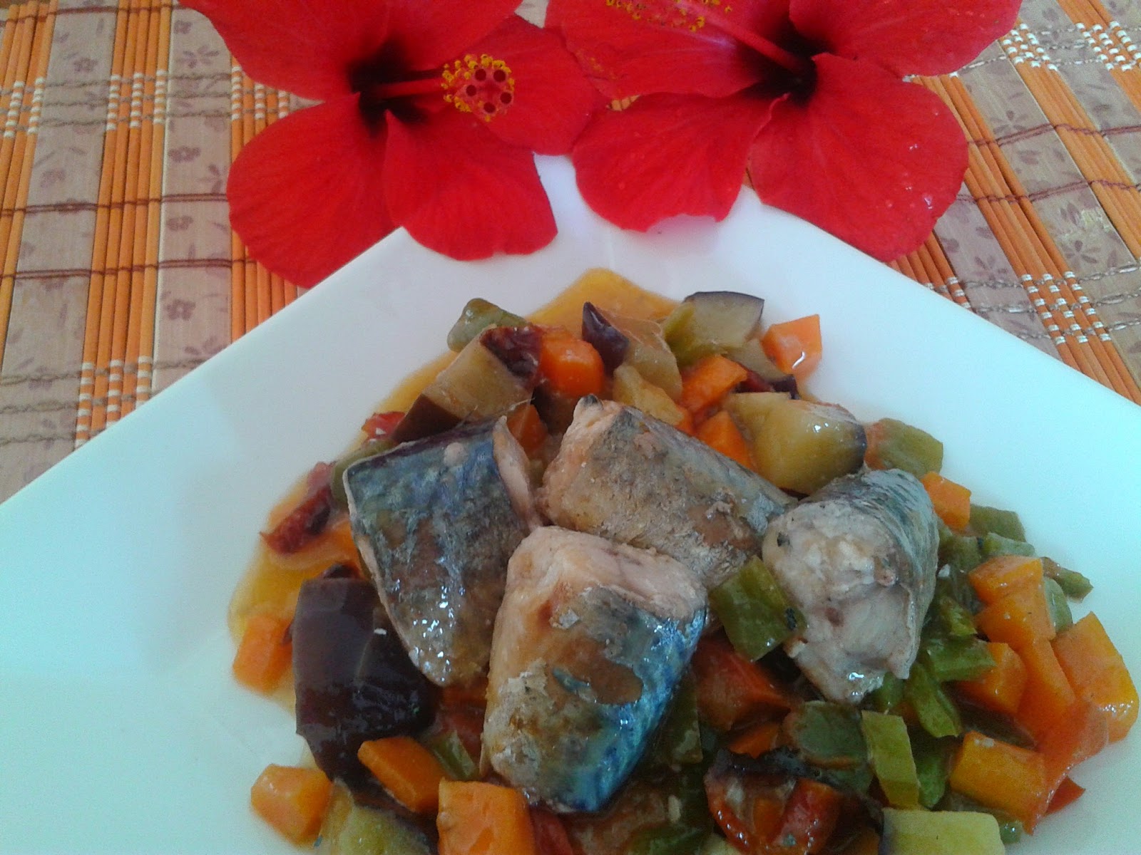 Esto guiso de caballa es otra manera de preparar un pescado el toque de las verduritas y el vermut deja una salsita muy buena y suave .