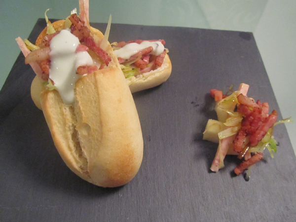 Ya sólo nos queda mezclar los ingredientes para meter dentro del bollo. Unimos la manzana y el puerro con el chopped. Rociamos el interior de la “babucha” con salsa de queso, metemos el mixto de manzana y por encima ponemos el bacon, echando posteriormente otro chorreón de queso y, listo para comer.