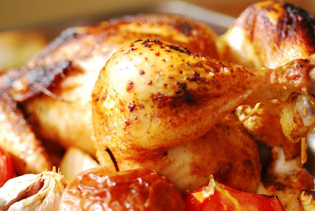 Colocamos el pollo salpimentado en una bandeja de horno y lo pincelamos bien con el majado que hemos hecho.