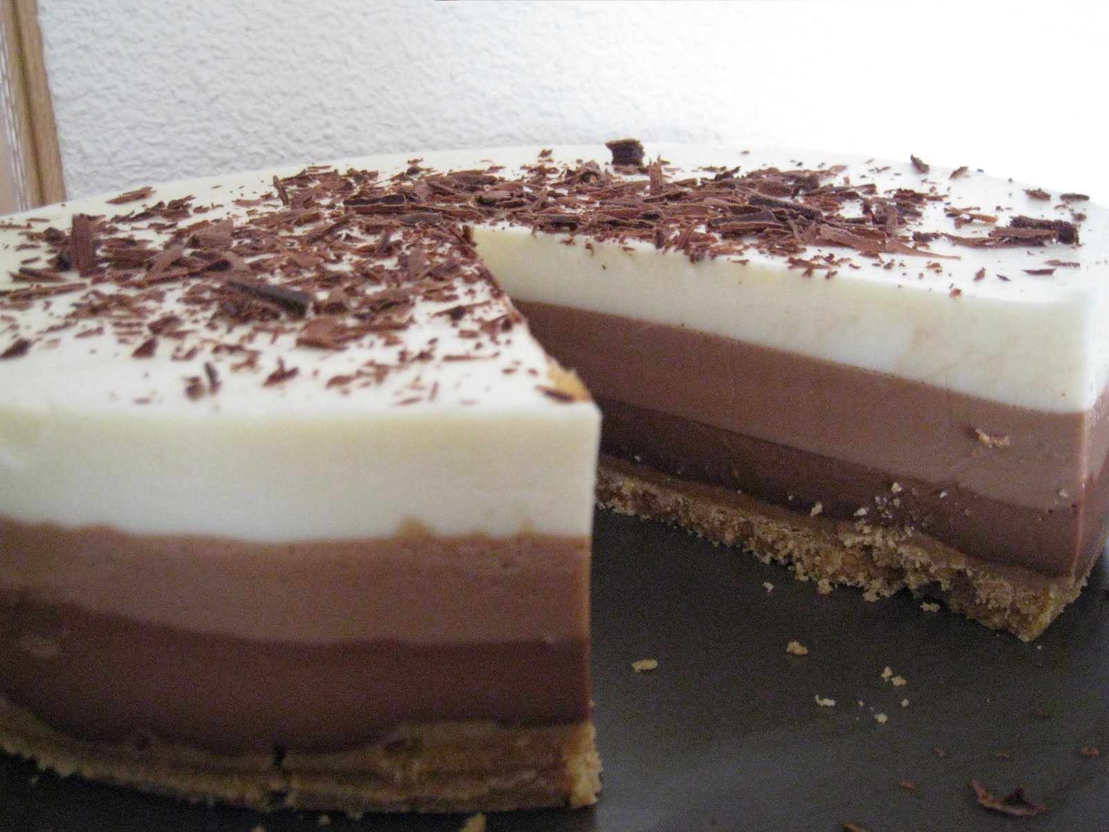 Mientras la primera parte se enfría, hacer lo mismo con la segunda y el chocolate con leche. Aseguraos de que la primera mezcla se ha enfriado bien y ha cuajado, antes de echar la segunda. Proceder de la misma manera con el chocolate negro.