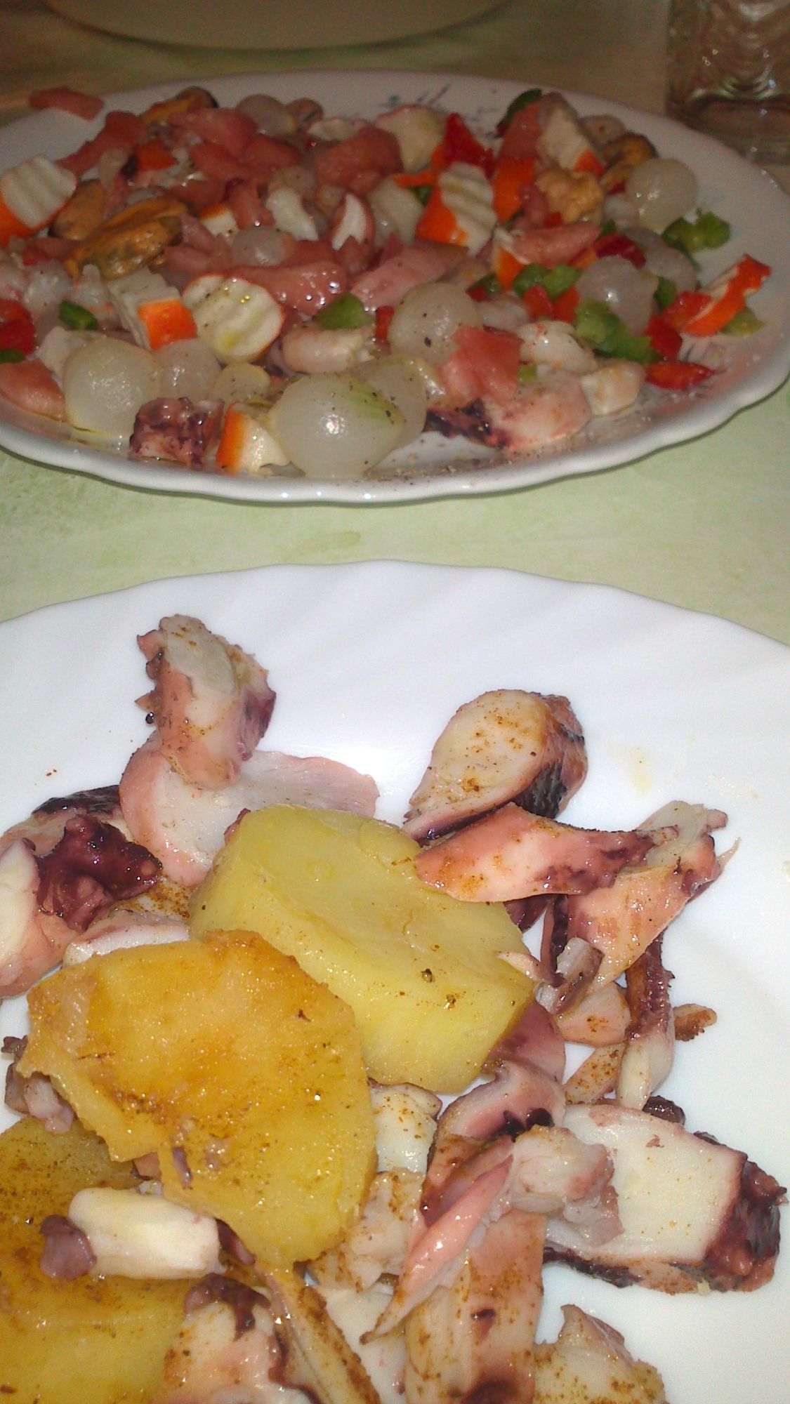 Trocear el pulpo y colocarlo sobre una base de patatas aderezadas con aceite y pimentón dulce o picante.