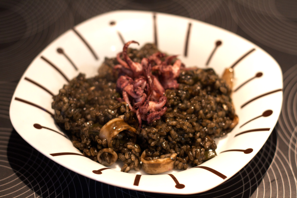 Se añade la tinta, pasándola por un colador, para evitar que caiga la telilla, y luego el arroz y se saltea todo junto. Como es un arroz seco, se pone el doble de caldo que de arroz, se comprueba de sal y se deja que se consuma el caldo a fuego medio.