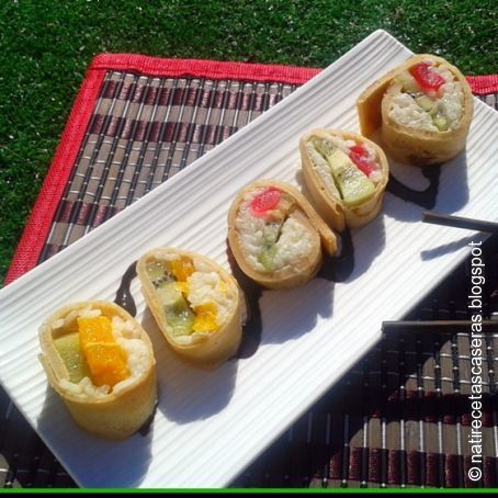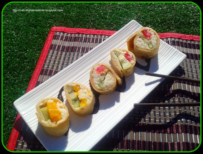 Esta receta a los niños les va a encantar sobe todo si os gusta el arroz con leche un sushi dulce , que vamos a preparar con unos sencillos creps , arroz con leche y frutas .