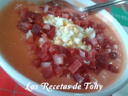 Repartir el salmorejo en cuencos. Acompañar con el huevo y el jamón picado (si os gusta podéis rociar con un hilo de aceite de oliva virgen) servir bien frio.