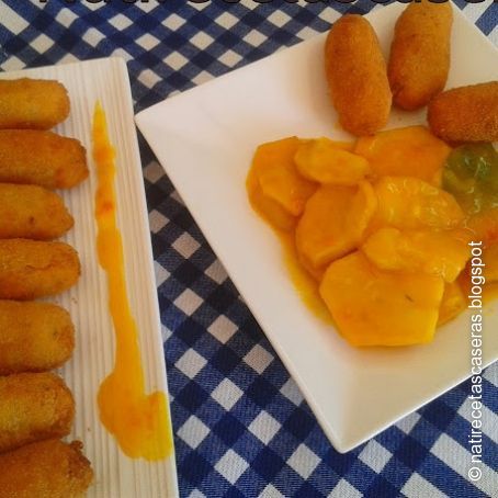 Os traigo unas croquetas de pavo y pollo con unas patatas en salsa las croquetas siempre las suelo hacer con la carne de los cocidos o de las sopas pero en este caso e comprado una pechuga de pavo y otra de pollo y me la han picado y con eso las e hecho, y las patatas es otra manera de comer patatas fritas quedan muy buenas y acompañan muy bien las carnes .