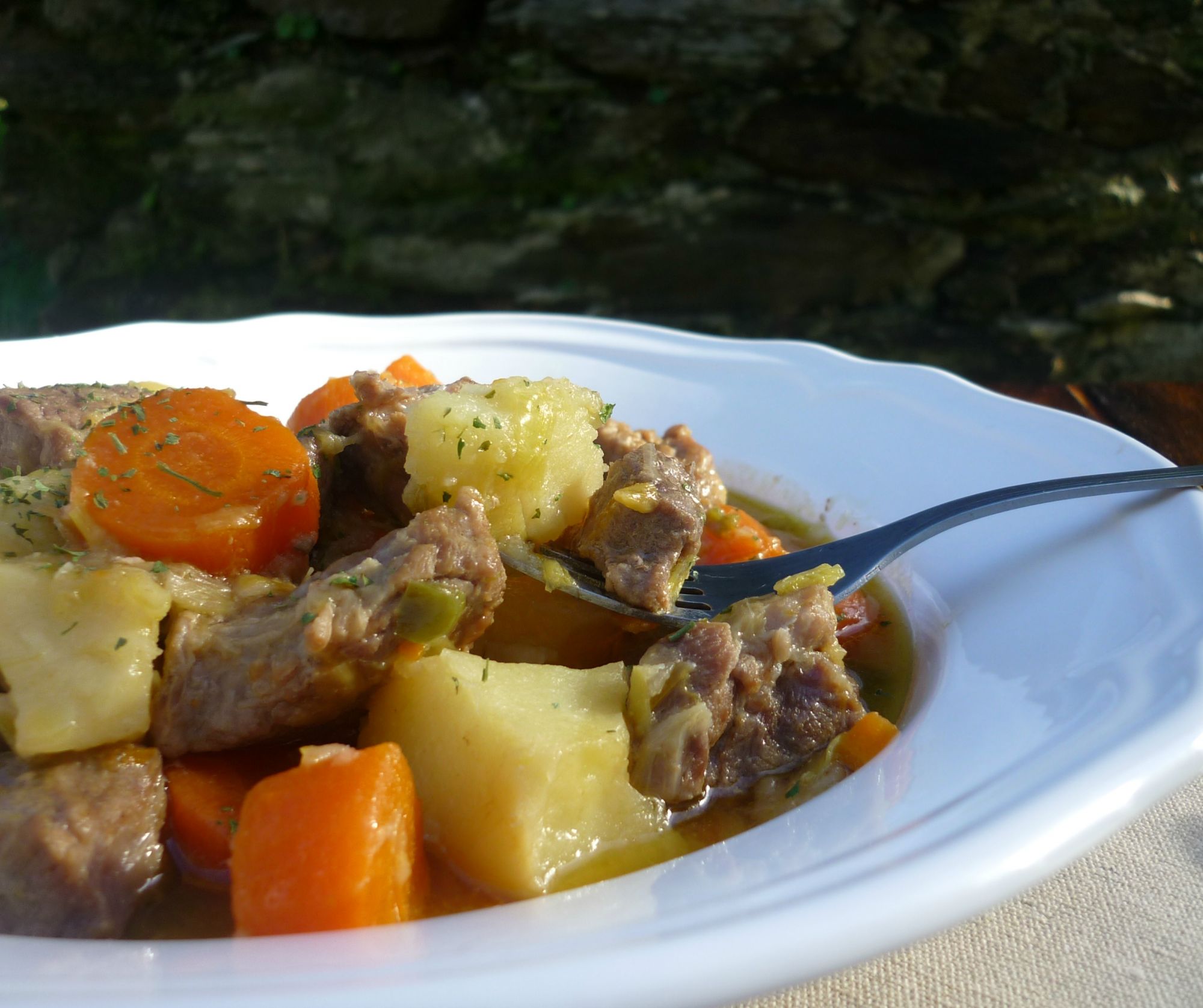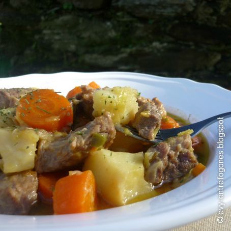Incorporamos la carne y dejamos un par de minutos que coja colorcillo. Añadimos el resto de las zanahorias en rodajas gruesas. Vertemos el vino blanco y dejamos evaporar el alcohol. Luego añadimos el caldo, cuando hierva salamos y bajamos el fuego. Dejamos una horita y cuarto que se haga lentamente.
