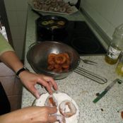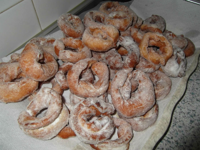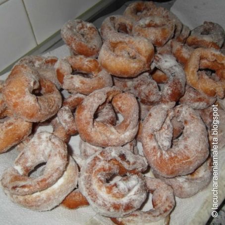 Dejamos que la masa repose durante quince minutos y comenzamos a realizar las rosquillas, eso sí enharinar bien la superficie y vuestras manos para que no se os pegue la masa. Lo primero que hacemos es coger un cacho pequeño de masa, la convertimos en una especie de rulo, la machacamos contra la mesa, la doblamos y la pegamos (haciendo la forma de la rosquilla) y así con el resto de la masa. A la hora de freírlas estiramos un poco el interior de la masa para que se haga más grande el agujero y las freímos en abundante aceite de girasol. Se sacan una vez que estén fritas, se escurre el exceso de aceite y se bañan en azúcar molida. A esta azúcar le ponemos un poco de harina para que sea más fácil que se adhiera a las rosquillas. Una vez que se enfríen ya están listas para comer.