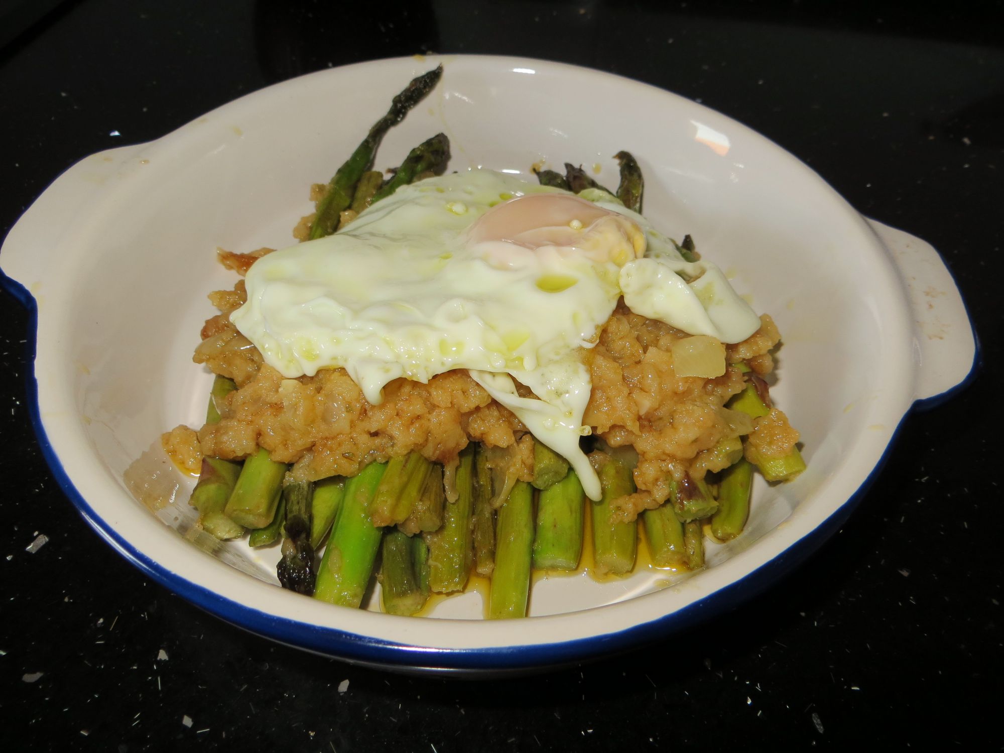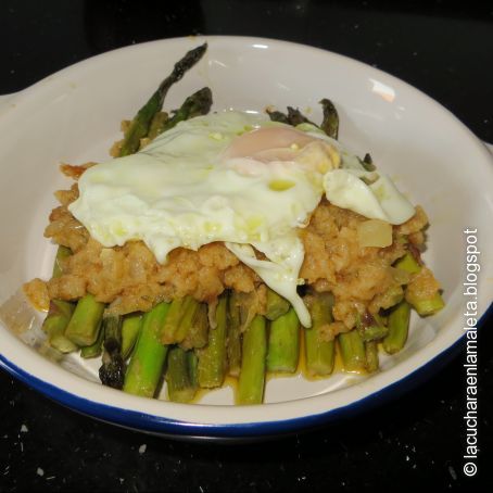 Por último, se fríe un huevo en una sartén con abundante aceite. La manera de presentarlo es en pequeñas fuentes, se echan los espárragos, luego el majado por encima y por último el huevo coronando el plato. Como veréis es un plato sencillos, pero muy sabroso.