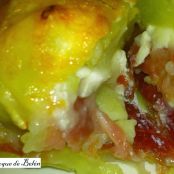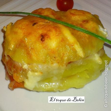 A continuación, se corta a lo largo en tres o cuatro rodajas y lo montas en un plato resistente al horno de la siguiente manera: una capa de patata, una de jamón, una de queso de cabra, otra de patata y así hasta que termines con patata y le pones encima o queso de cabra o queso rayado y al horno a gratinar.