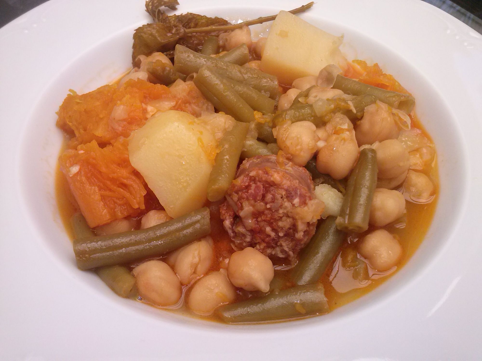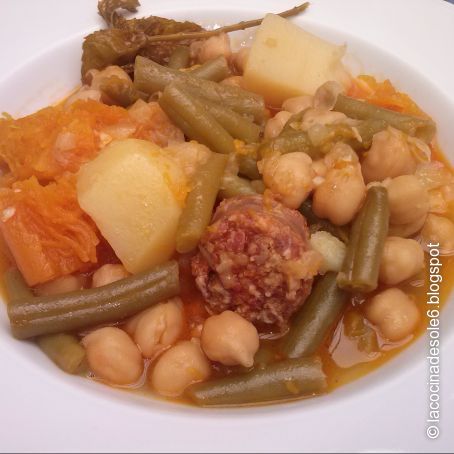 Lo pochamos, y a continuación agregamos las judías verdes, los garbanzos enjuagados y escurridos, la calabaza cortada a trozos, los trozos de chorizos y las patatas peladas y cortadas a trozos también.
