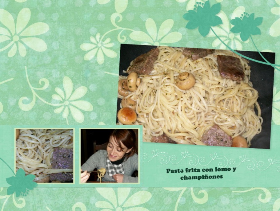 En un wok super caliente con poco aceite, sellamos nuestro lomo en trozos, junto al ajo, y los champiñones.
