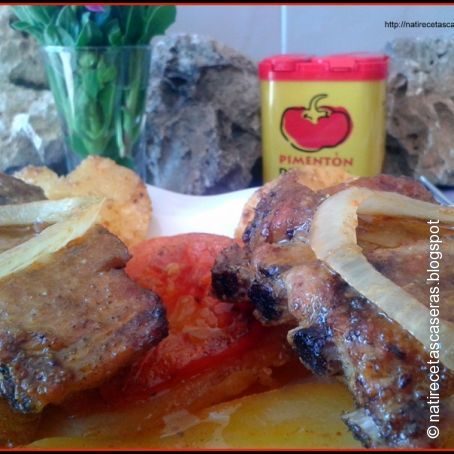 Ponemos en la bandeja aceite de oliva ,una capa de patatas , una de cebolla y una de tomates y encima las rodajas de piña , le echamos sal pimentón y yo le puse unas especies que uso que ya van preparadas especiales para hacer pinchos quedan muy buenas y le van muy bien a las carnes y a las patatas , ponemos las costillas encima y metemos al horno.