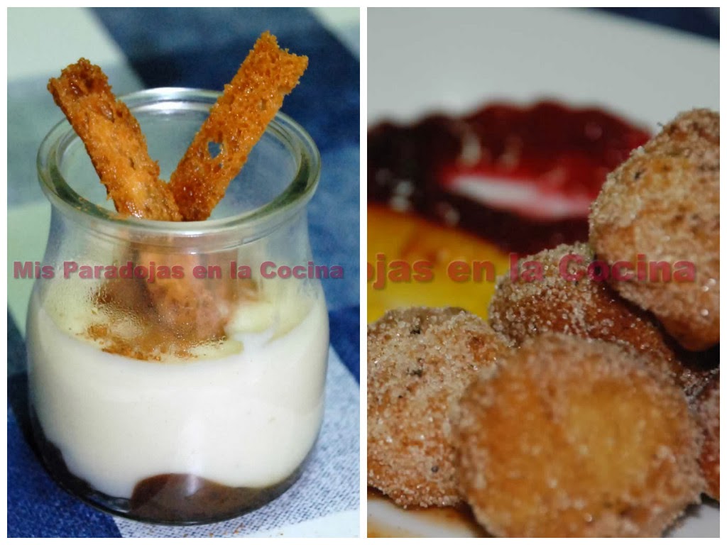 Colamos el aceite y lo ponemos ya limpio con la harina para hacer una roux mezclando con unas varillas. A continuación. agregamos la leche colada, el azúcar y seguimos mezclamos con las varillas hasta que espes (unos 10-15 minutos a fuego moderado fuerte para la poleá y unos 20-25 minutos para las croquetitas). Llegados a este punto, realmente ya hemos terminado de hacer la poleá tradicional, ya que tan solo nos queda que atempere ya sea a temperatura ambiente o en el refrigerador. Os presento un ejemplo de presentación en vasito tipo yogurt con un fondo de crema de castañas, más su canela molida y su pan frito.
