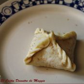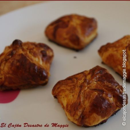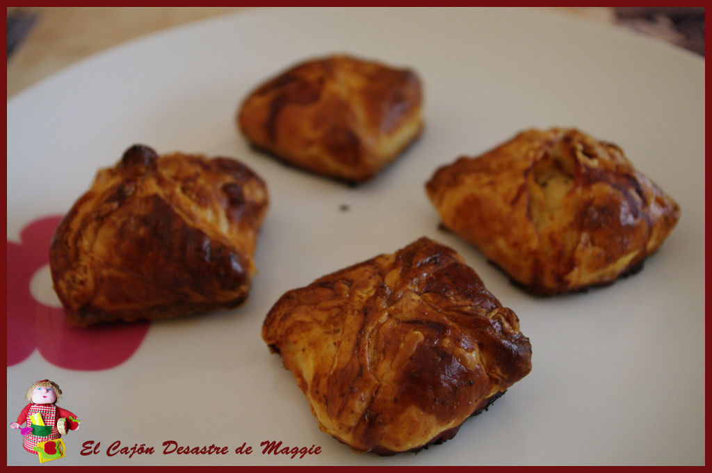 Extender la lámina de hojaldre sobre la encimera espolvoreada de harina con ayuda de un rodillo. Cortar la lámina en cuadrados de unos 10 x 10 cm y colocarlos en la bandeja de horno sobre papel vegetal. Untar con huevo batido y reservar.