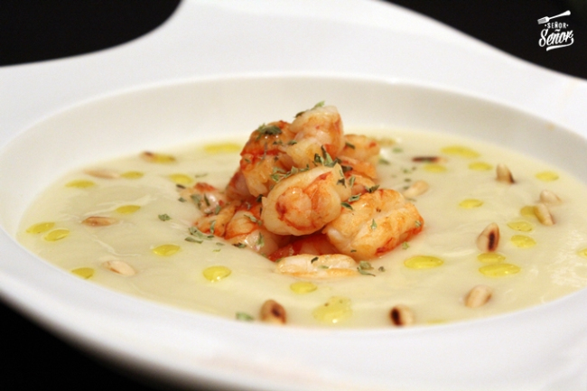 Crema de coliflor con gambones y piñones al aroma de trufa