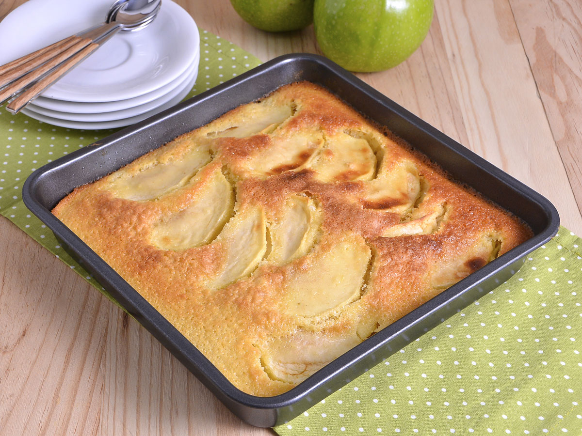 A continuación, en un molde engrasado con un poco de mantequilla, vamos alternando una capa de la pasta que hemos elaborado anteriormente y una de manzana (cortada en rodajas gruesas). Terminamos con una capa de pasta.