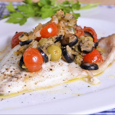 Dorada al horno con aceitunas, alcaparras y tomates cherry