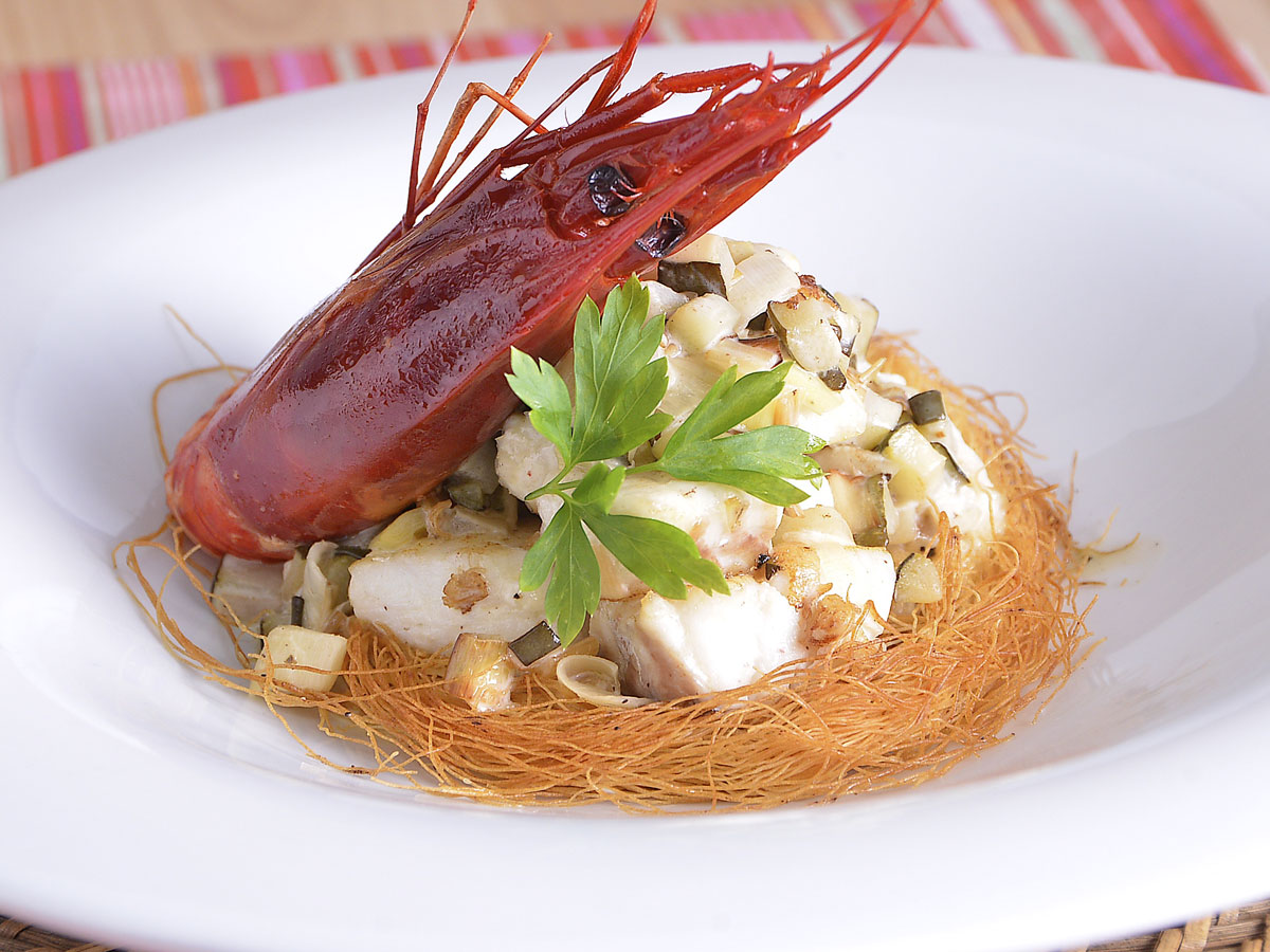 Nidos crujientes de merluza al cava con carabineros